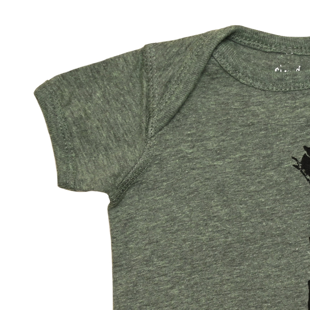 Onesie is cut from 100% cotton and features fold-over shoulders and snap bottom. Machine wash cold; tumble dry. Do not iron over screen print.