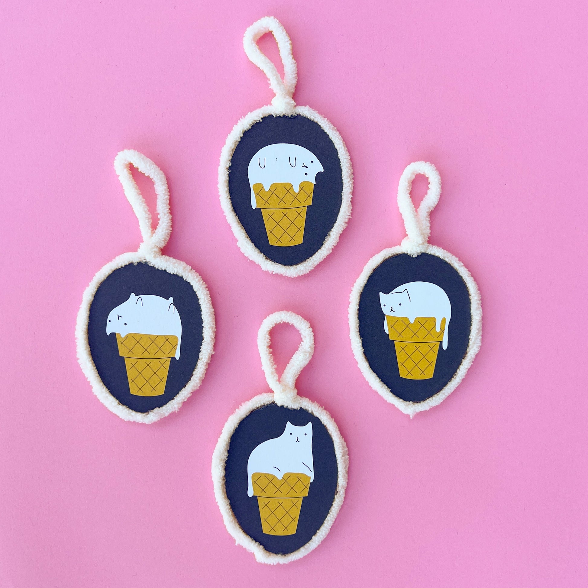 Our Cat Cone ornaments are made from upcycled vintage wrapping paper, balsa wood and yarn. Each ornament is unique and comes with one of the 4 shown prints.
